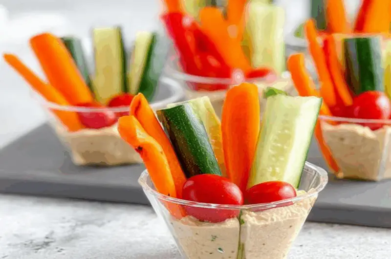 - Insert vegetable sticks into the hummus, mixing colors for visual appeal.