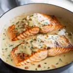 Creamy Garlic Butter Tuscan Salmon is a delectable seafood dish characterized by its rich and creamy sauce infused with garlic and herbs. The recipe typically features pan-seared salmon fillets coated in a luscious butter sauce made with heavy cream, sun-dried tomatoes, and spinach for added nutrition and flavor. This dish is often served over pasta or rice, making it a complete meal that’s perfect for special occasions or weeknight dinners.