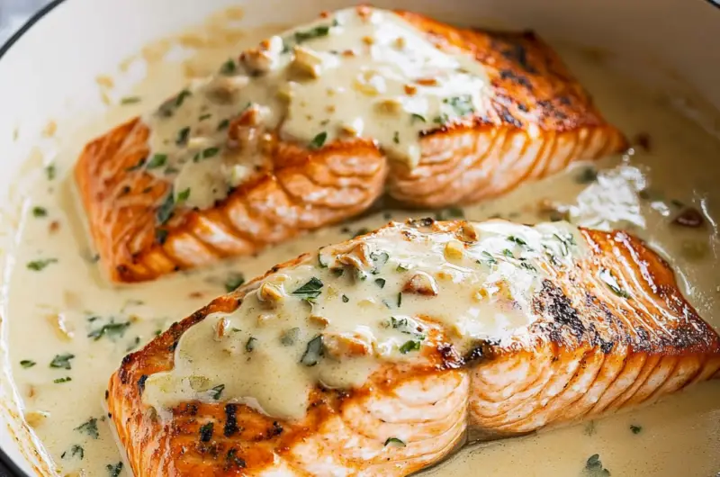Return cooked salmon fillets into the skillet with the creamy mixture. Allow them to simmer briefly so they absorb some of that delicious flavor—just around one minute.