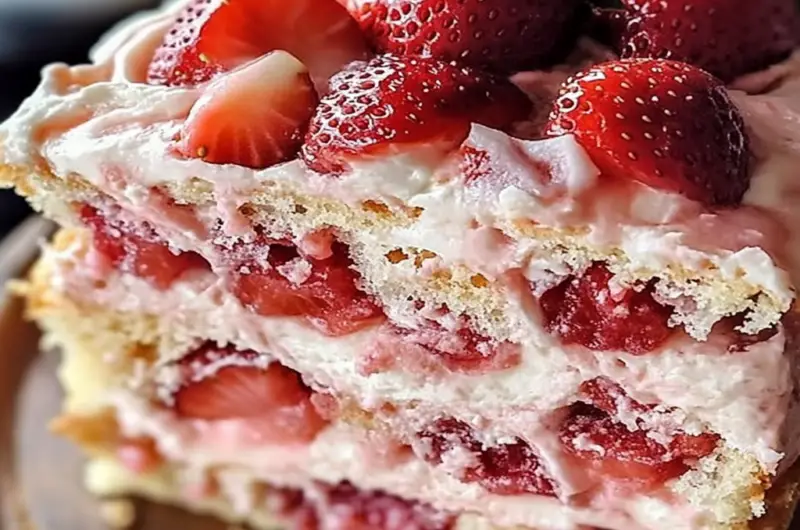 Picture this: it’s a sunny afternoon, and you’re surrounded by friends and family at a backyard barbecue. Laughter fills the air as someone takes a bite of this delightful cake and immediately declares it their new favorite dessert. Memories are made over this cake, creating connections as sweet as the strawberries nestled atop each slice. Whether it’s for birthdays, picnics, or just because it’s Tuesday (who needs an excuse?), this cake will have everyone begging for seconds.