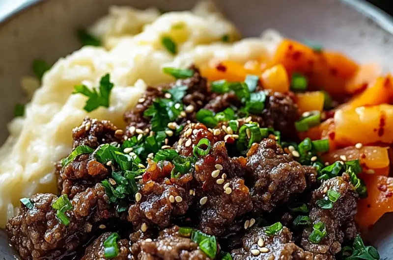 A Korean Ground Beef Bowl is a delicious dish featuring seasoned ground beef served over rice with various toppings such as vegetables and sauces. This meal is known for its balance of sweet and savory flavors, often incorporating ingredients like soy sauce, brown sugar, garlic, and ginger. It is quick to prepare and customizable based on personal preferences or dietary restrictions. The bowl usually includes fresh vegetables for added nutrition and texture, making it a wholesome option for any meal.