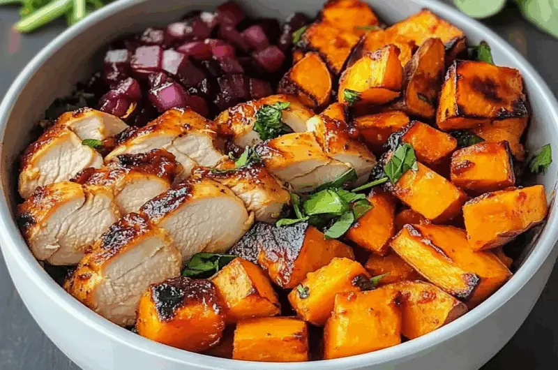 Yes, you can easily make BBQ Chicken & Roasted Sweet Potato ahead of time. Prepare the chicken and sweet potatoes in advance, then store them in separate airtight containers in the refrigerator. When you’re ready to serve, reheat the ingredients and assemble your bowls with any desired toppings. This is a great meal prep option for busy weeks.