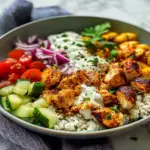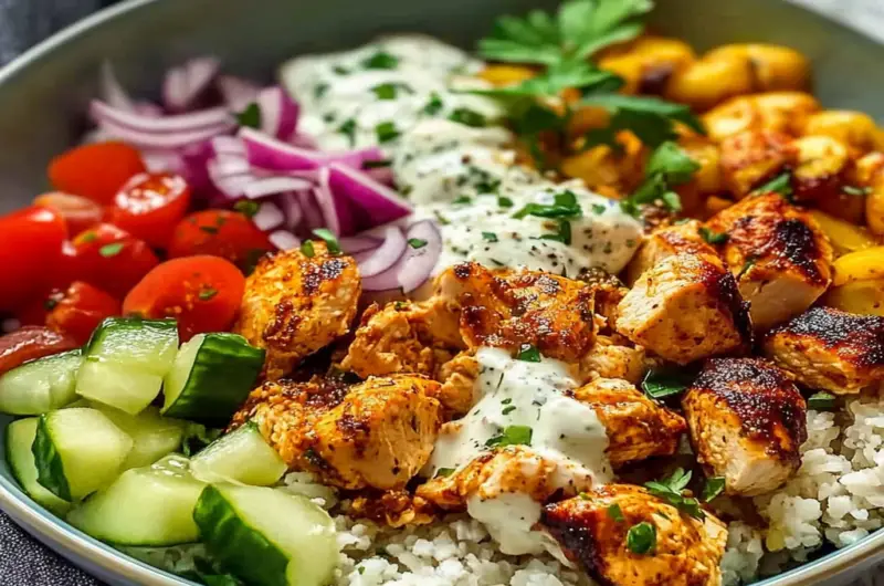 Indulge in the vibrant flavors of the Mediterranean with this delicious Chicken Bowl. Juicy, marinated chicken is grilled to perfection and served over a bed of fresh veggies and grains. Topped with creamy feta and a zesty dressing, each bite transports you to sun-kissed shores. Perfect for meal prep or impressing guests, this dish combines taste and health in one colorful bowl.
