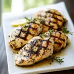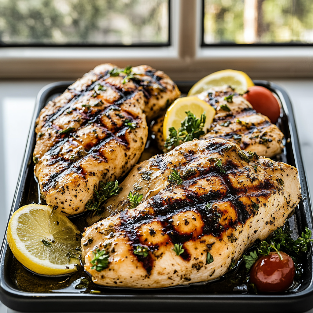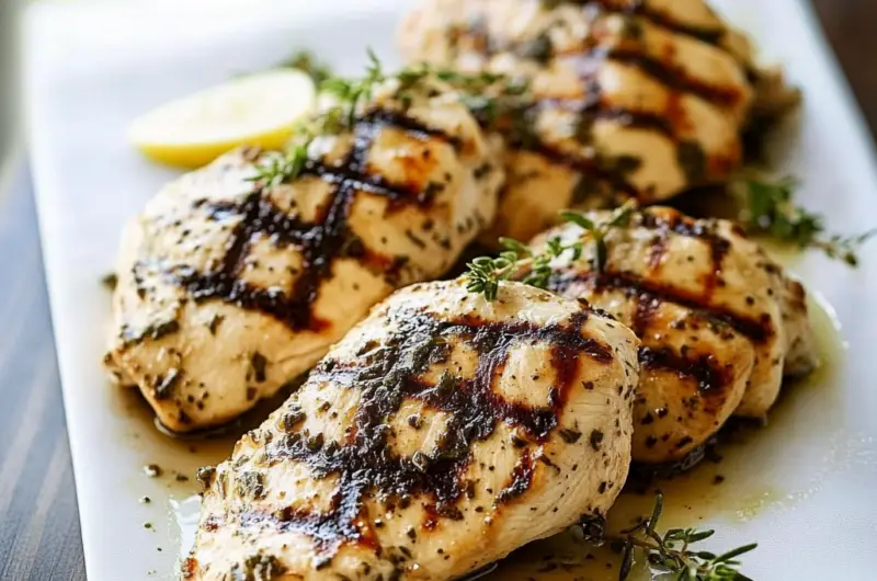 Transfer cooked chicken onto plates; garnish with fresh herbs if desired. Drizzle with leftover marinade before serving for added flavor.