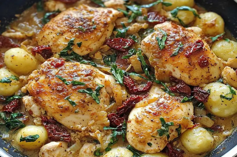 One Skillet Sun-Dried Tomato Chicken and Gnocchi is a delicious, easy-to-make dish that combines tender chicken, flavorful sun-dried tomatoes, and soft gnocchi in a creamy sauce. This recipe is perfect for busy weeknights because it all cooks in one skillet, making cleanup a breeze. creamy spinach tortellini dish The blend of ingredients creates a rich flavor profile that everyone will love.