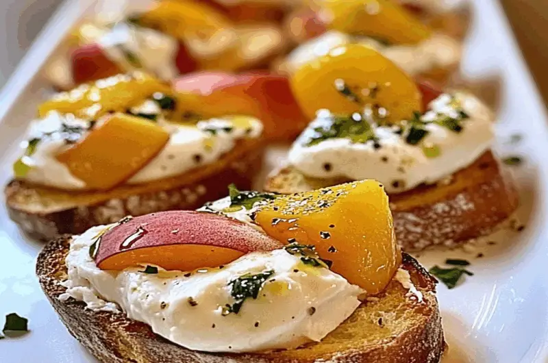 In summary, the Peach Burrata Crostini Appetizer is an elegant yet simple dish that combines sweet peaches and creamy burrata on crispy bread. The recipe is quick to prepare and perfect for summer gatherings or casual get-togethers. By using fresh ingredients like basil and balsamic glaze, you enhance the overall flavor profile of this delightful appetizer. homemade peach jam recipe Whether enjoyed at a party or as a light snack at home, these crostinis are bound to impress your guests!