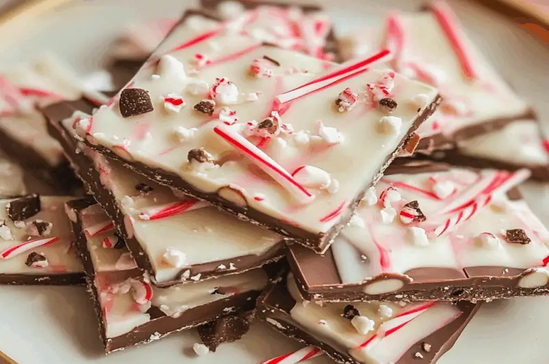 First, melt the dark chocolate and pour it onto a lined baking sheet, spreading it evenly. After it sets slightly, melt the white chocolate with peppermint extract. Drizzle this over the dark chocolate for that stunning marbled effect. Top with crushed candy canes before chilling until firm.
