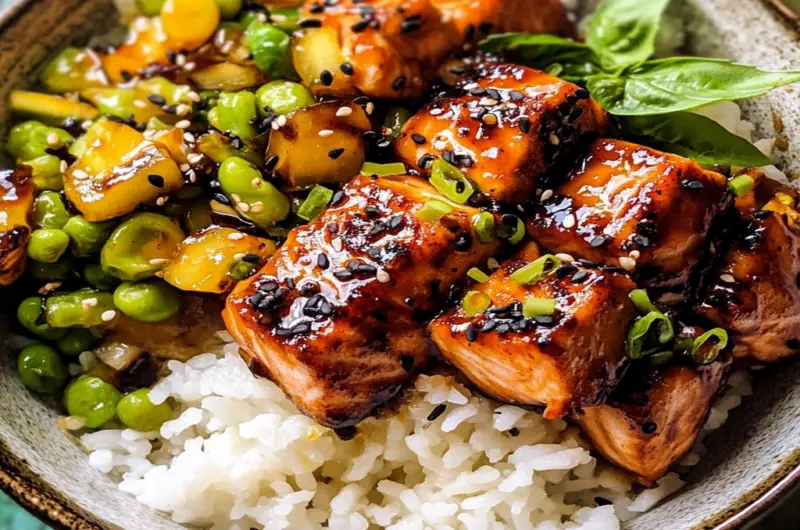 - Assemble bowls by placing cooked rice at the bottom, topped with roasted salmon and sautéed vegetables. Drizzle remaining marinade over the top before serving.