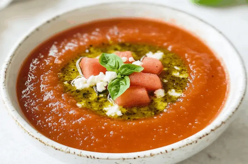 In summary, spicy watermelon gazpacho is a delightful blend of sweet and savory flavors that refreshes your palate during hot summer days. The simple ingredients come together to create a vibrant dish that is both nutritious and satisfying. Whether enjoyed as an appetizer or light meal, this recipe allows for creativity through various ingredient substitutions and garnishes. Embrace the unique charm of this cold soup and impress your guests at your next gathering! For more inspiration, check out this Baked Apples with Feta recipe.